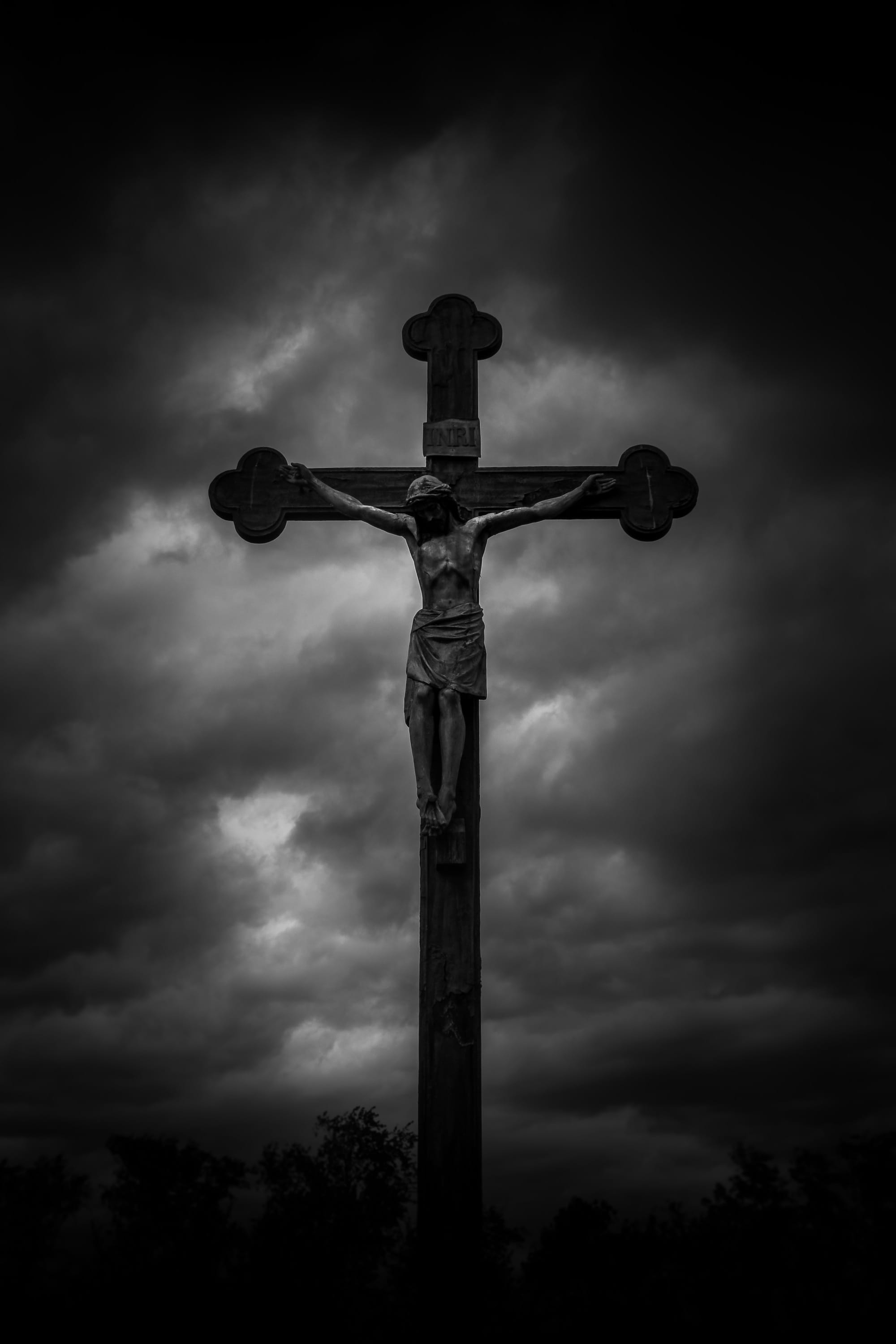 A dramatic, high-contrast image of a crucifix standing alone against a sky heavy with clouds, that features Christ on the cross, caught in a faint, somber light. The trees at the bottom are silhouettes, emphasizing how the cross rises above everything, stark and solitary. Even with its darkness, the scene carries a sense of depth and gravity, as though the entire sky is pausing to witness a moment of immense significance. The composition draws the eye upward, centering on the intersection of suffering and sacrifice. Yet, within this somber tone, the cross itself becomes a symbol of hope. In Christian tradition, it is not merely a sign of death, but a doorway into resurrection and a reminder that despair is not the final story. The storm clouds evoke the weight of grief, but they also hint at change; storms pass, darkness lifts, and dawn breaks. The cross stands resilient in the midst of gloom, pointing beyond the present shadow to the promise of renewal. It embodies the paradox at the heart of resurrection hope: that life can rise from loss, light can break through even the darkest sky, and love that is steadfast and self-giving does endures beyond death.The cross is both a memorial of sacrifice and a beacon of something more: a quiet, powerful assurance that hope remains.